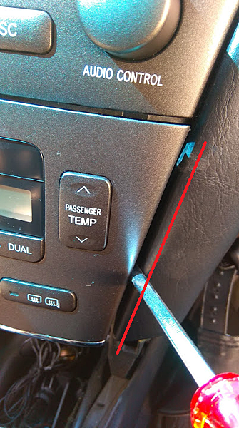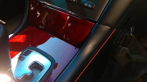 排檔桿處,紅線畫的地方就是接縫處,用手就可扳開;需先打到N檔,不然P檔拆開時會卡到,並請確認鑰匙在熄火、也斷電的位置