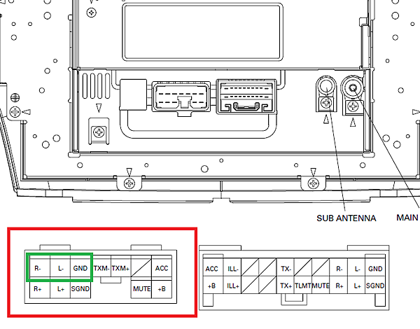 其中綠色框,「R-、L-」就是左右聲道輸入、「GND」則是接地,是就是我們要做AUX-in線要接上的位置